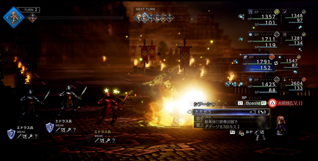 また通常攻撃ではシールドを1つしか削れませんが、BPを使う(ブースト)ことで通常攻撃を連撃にしたり、キャラ毎のアビリティを強化できます。BPの使いどころやブレイク前にバフ(味方の強化)/デバフ(敵の弱体化)を掛けることで戦闘を有利に進めることができます。